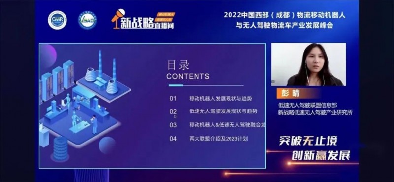 11月23日,由中國移動(dòng)機(jī)器人(AGV/AMR)產(chǎn)業(yè)聯(lián)盟、低速無人駕駛產(chǎn)業(yè)聯(lián)盟、《物流搬運(yùn)機(jī)器人》雜志社、《低速無人車》雜志社、成都北辰中金展覽有限公司聯(lián)合主辦,新戰(zhàn)略移動(dòng)機(jī)器人全媒體、 新戰(zhàn)略低速無人駕駛?cè)襟w協(xié)辦的2022中國西部(成都)物流移動(dòng)機(jī)器人與無人駕駛物流車發(fā)展峰會(huì)在線上成功舉行!